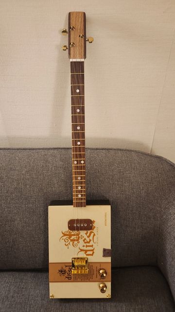 A heavy Diesel cigar box with a Fear No Beard custom pickup, walnut fretboard, laminated walnut and oak headstock, and gold hardtail bridge and hardware. FNB pickups have a solid sound.