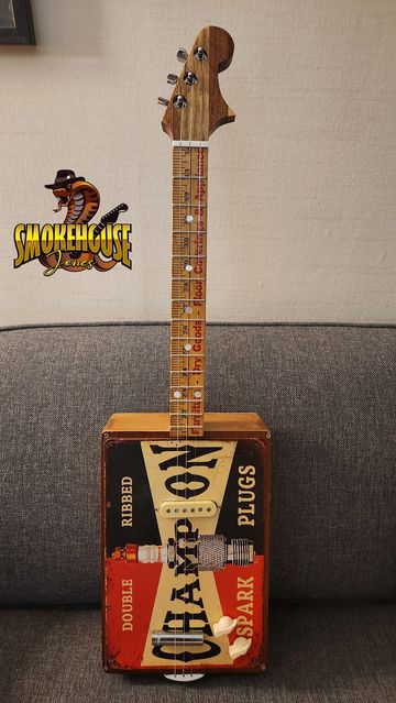 A vintage-style Champion Spark Plugs signs is the soundboard for this three-string guitar. A vintage yardstick serves as the fretboard, with a laminated oak, purple heart wood, cedar and maple headstock up top. The bridge is an 11-mm socked (I lost the 10 mm!). Single pole pickup controlled by volume and tone knobs.