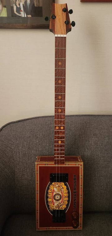 This is an 18-fret three string guitar with four-pole pickup, walnut fretboard, oak fret inlays, bottlecap volume and tone knobs, with a handmade bridge on an upside-down cat food bowl, all built around a discarded cabinet drawer found by the side of the road. It is almost the size of an acoustic dreadnought, and has amazing resonating sound.
