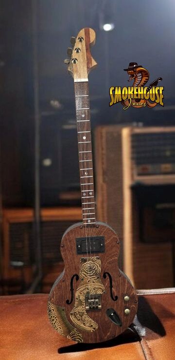 This acoustic/electric is a 25" scale three-string with humbucker pickup, push/pull tone pot, and antique brass hardware throughout. The guitar top is adorned with ceiling tile pieces similar to early 1900's buildings, cut for decoration and to serve as a pickguard. The headstock is laminated oak, cedar and walnut.
